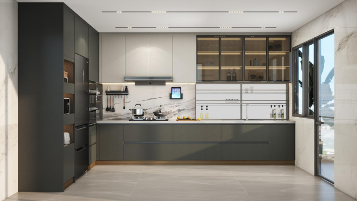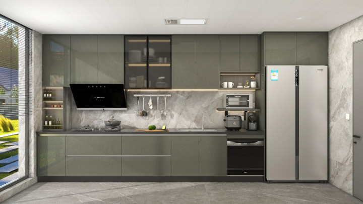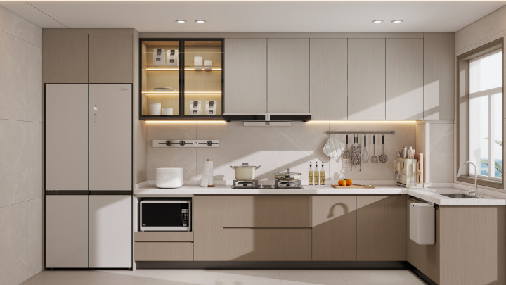 电器搭配主打全嵌隐形化,柜电齐平无凸出。烹饪区选集成灶/嵌入式烟灶套装,控烟强、省空间;搭配嵌入式蒸烤一体机,满足中西料理。储物区用底部前置散热全嵌冰箱,与橱柜无缝融合;标配13套以上嵌入式洗碗机,解放双手。小家电做抽屉式收纳,即拉即用、整洁不乱。