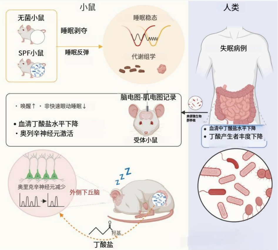 关键的证据来自“菌群移植”实验:当研究人员将失眠小鼠的肠道菌群移植给健康无菌小鼠后,后者竟也开始表现出典型的失眠行为。这直接证明,紊乱的菌群足以“传递”失眠。