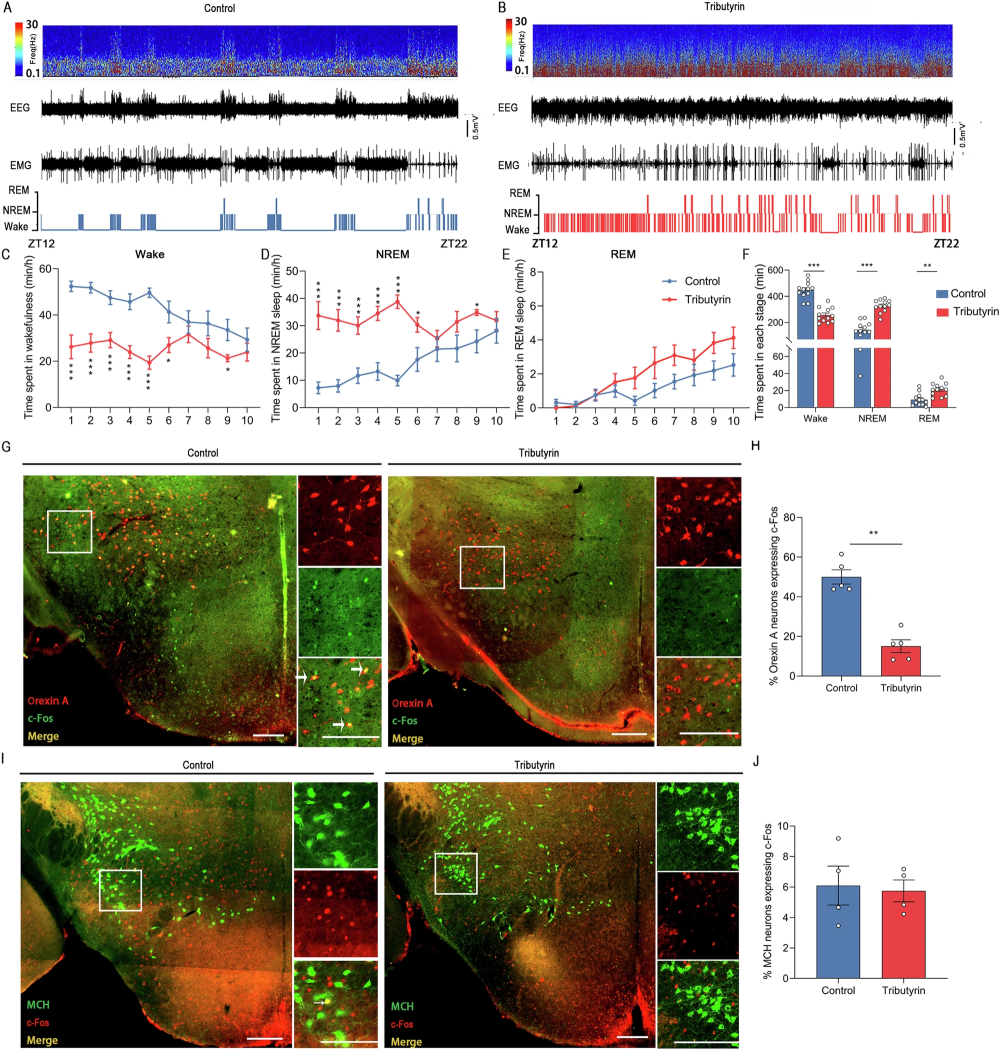 丁酸可通过作用于小鼠下丘脑外侧(LH)脑区,特异性抑制该区域内食欲素神经元(负责让人清醒、有食欲、保持觉醒)的激活与兴奋性,使大脑更放松、更平静,进而减少觉醒、促进深度睡眠。